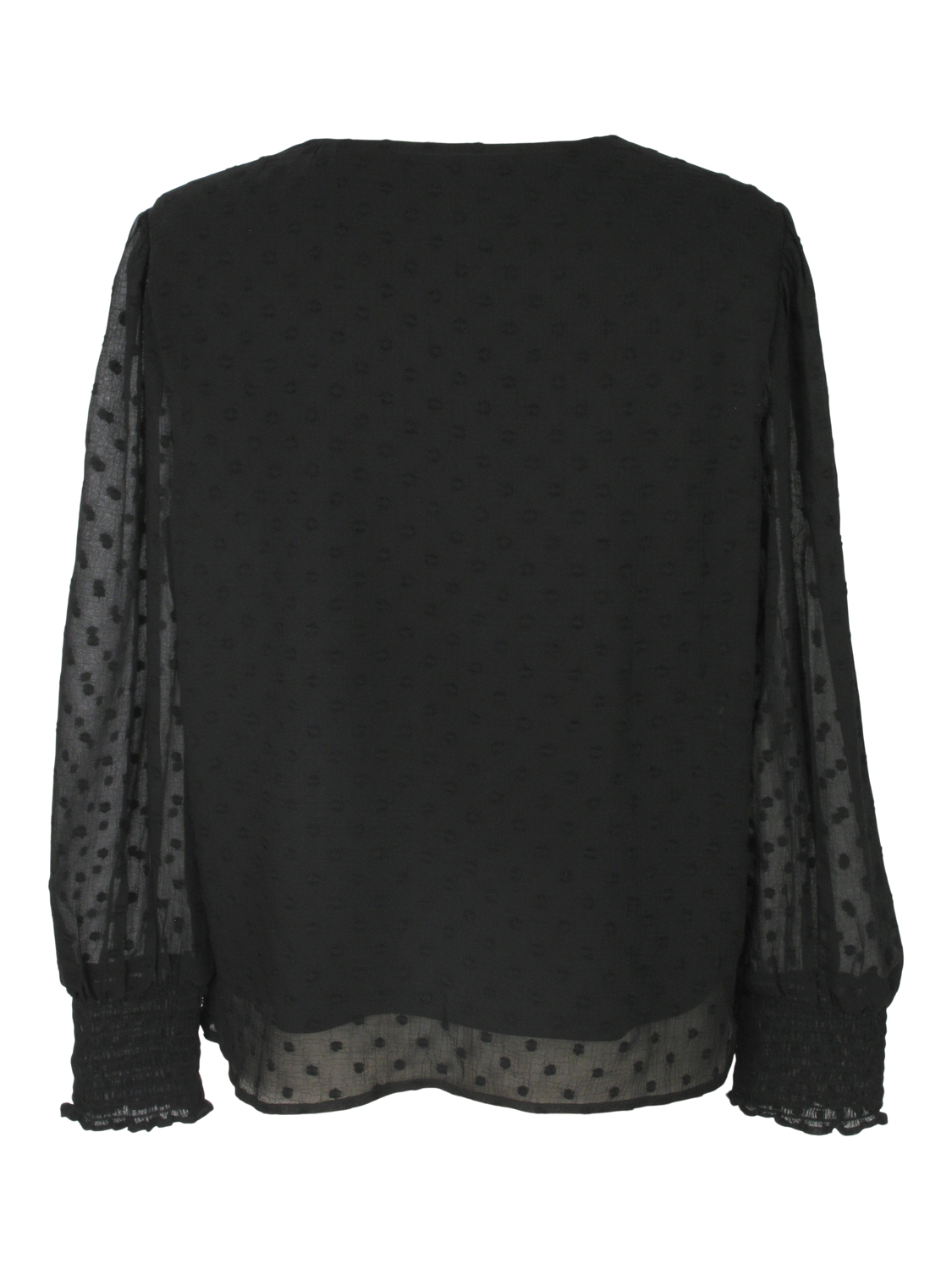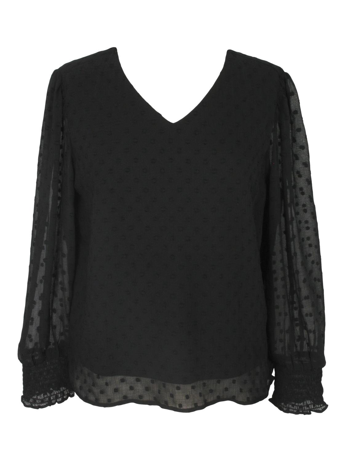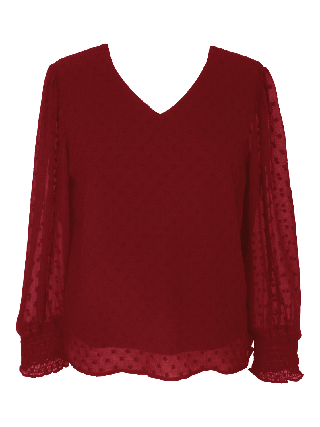 Blus med puffärm och lång ärm, smock i ärmslutet. Härlig blus/topp i vävd transparent polyesterchiffong. Kroppen är fodrad i viskostrikå. Finns i storlekarna S-XXL. Färg: svart och röd.