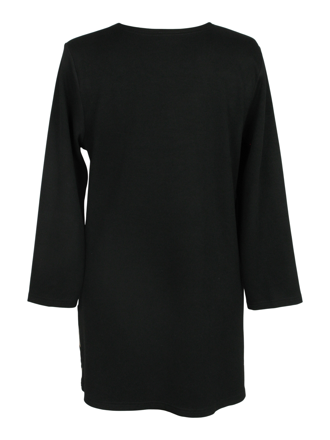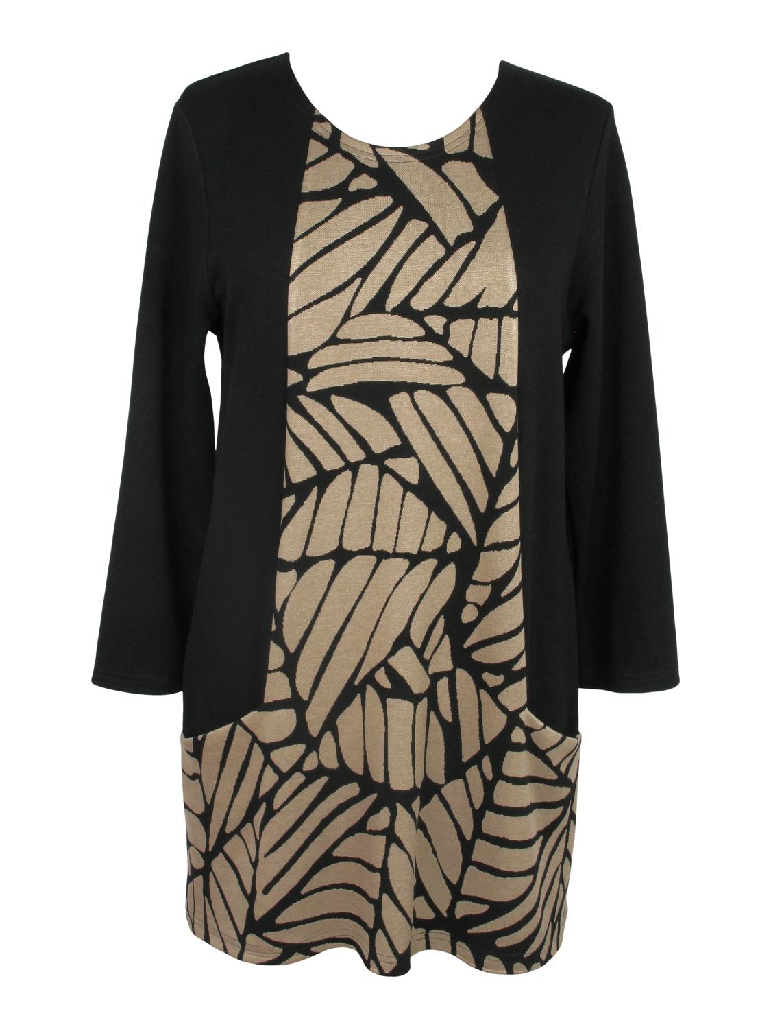 Tunika med Jacquardstickat mönster i fram. 3/4-lång ärm och rakt avslut nertill. Två fickor fram. Tillverkad i Europa. Finns i storlekarna S till XXL.