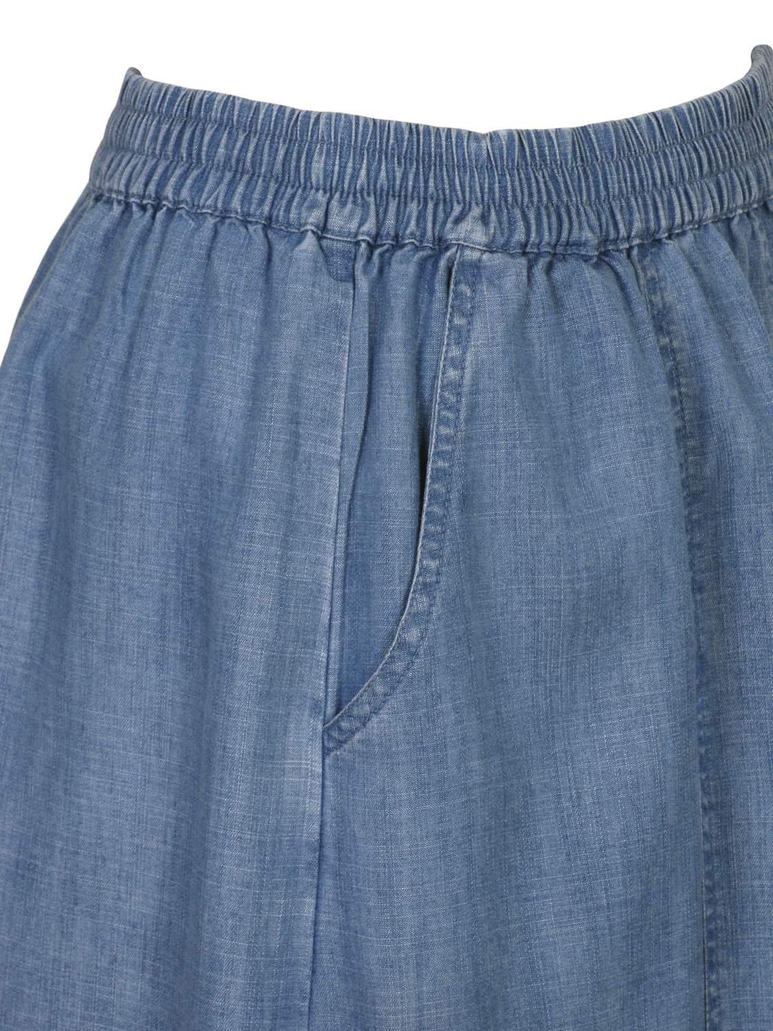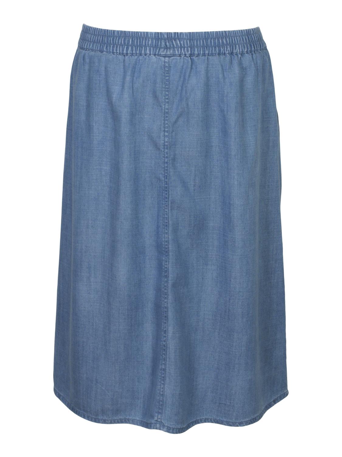 "Jeans-kjol" i mjuk Lyocell. Dekorsömmar fram och en söm mitt bak. Resår i midjan som går hela vägen runt, fickor i fram. Tillverkad i Indien. Finns i storlekarna S till XXL i färgen Jeansblå.