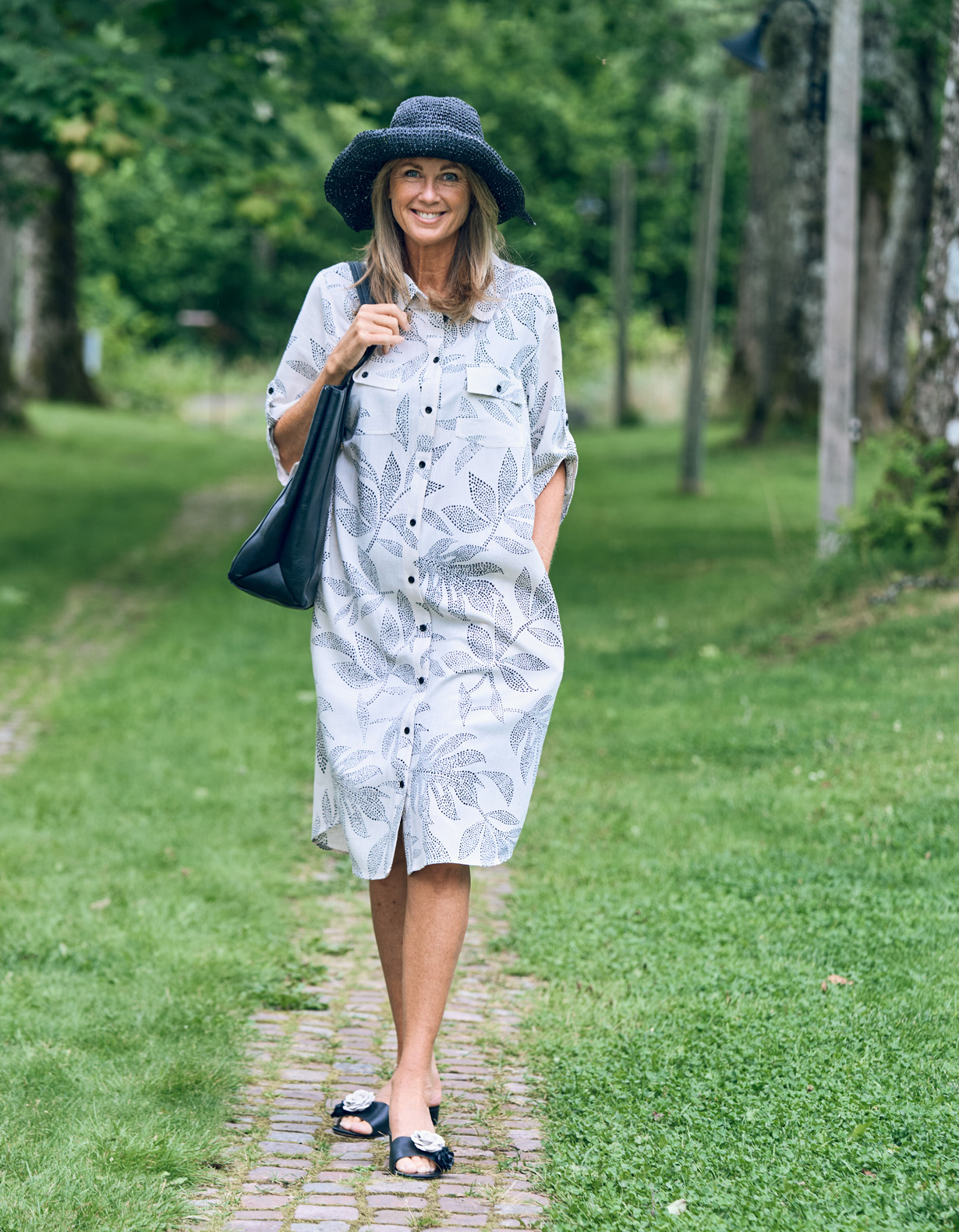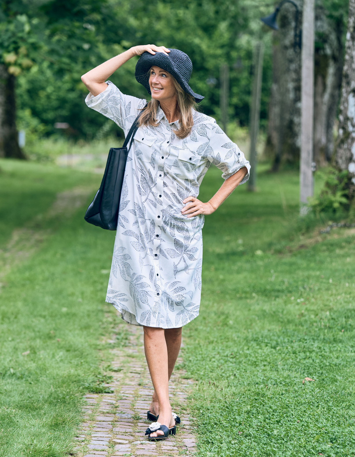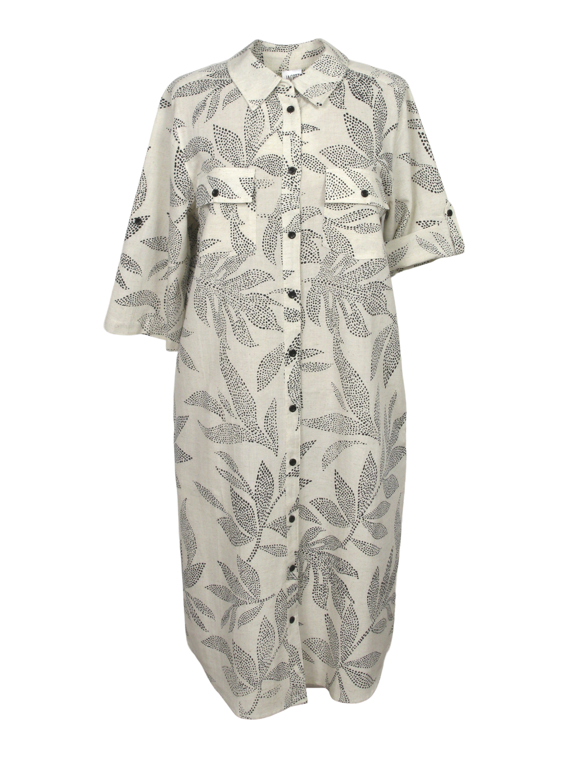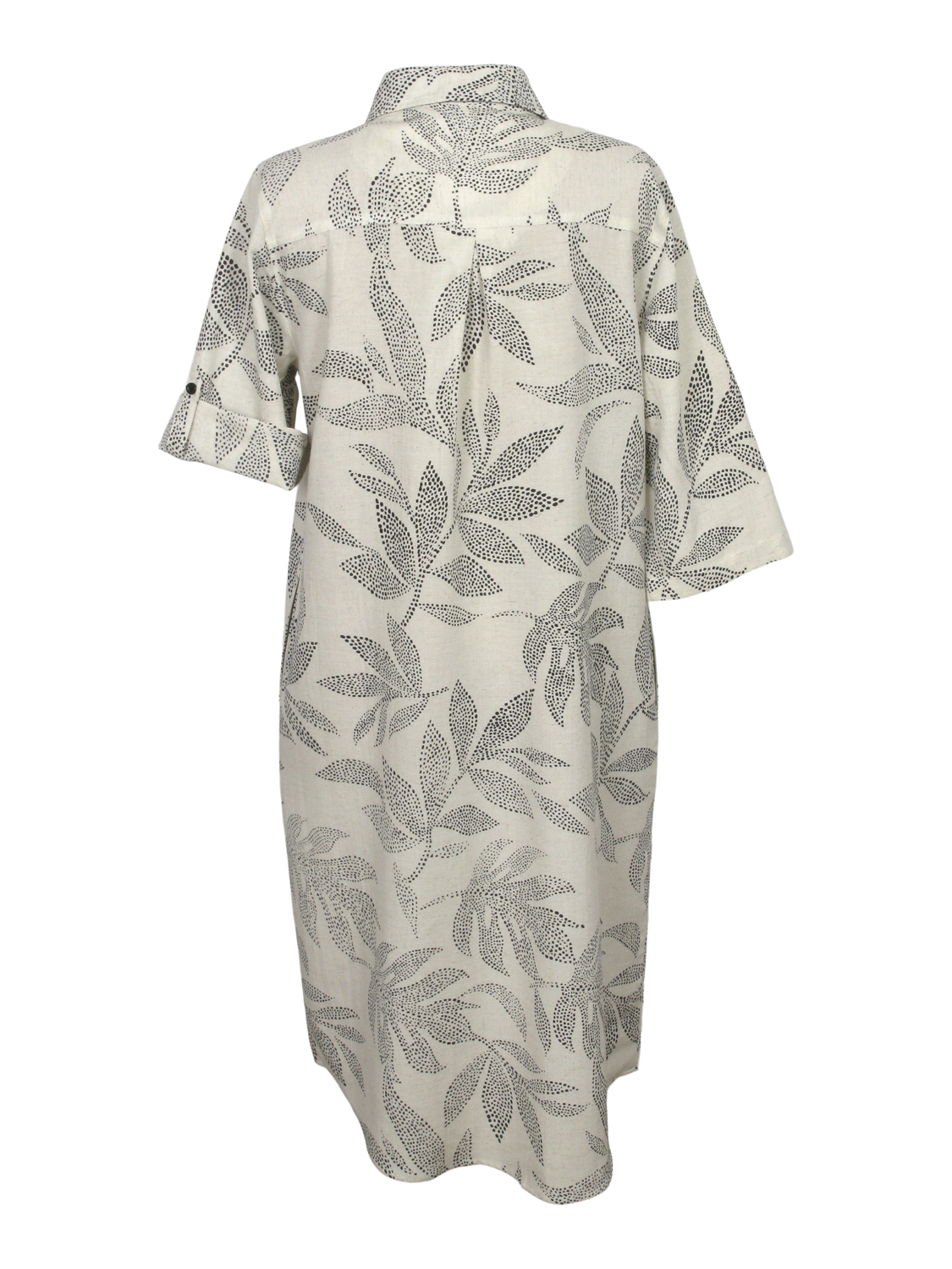 Härligt luftig klänning i vävd linne-look. Svart mönster på naturfärgad botten. Genomknäppt modell med krage. Rundad nederkant. Två bröstfickor fram och även fickor i sidsömmarna. Uppvikbara ärmar med slejf och knapp. Ok bak med veck. Finns i storlekarna S-XXL. Naturfärg.