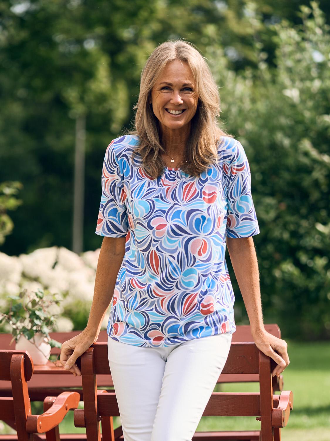 Mönstrad trikåtopp med kort ärm. Dekorativ "rynkning" i halsringningen, toppen har rakt avslut nertill. Denna topp är tillverkad i Polen, i en mjuk och skön trikå. Finns i storlekarna S till XXL.