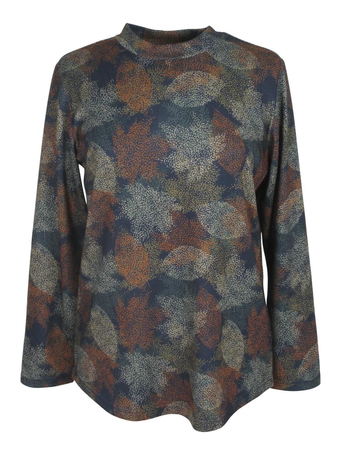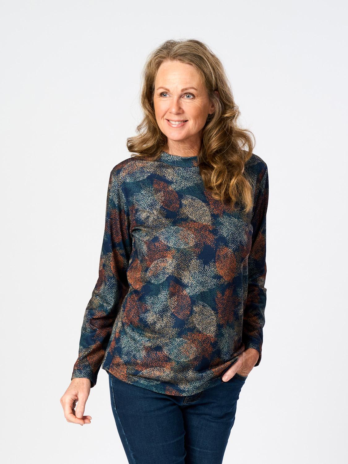 Mönstrad topp i mjukt och skönt material. Lätt ruggad yta. Toppen har lång ärm och ett lite rundat avslut nertill. Halvpolo. Tillverkad i Asien. Finns i storlekarna S till XXL.