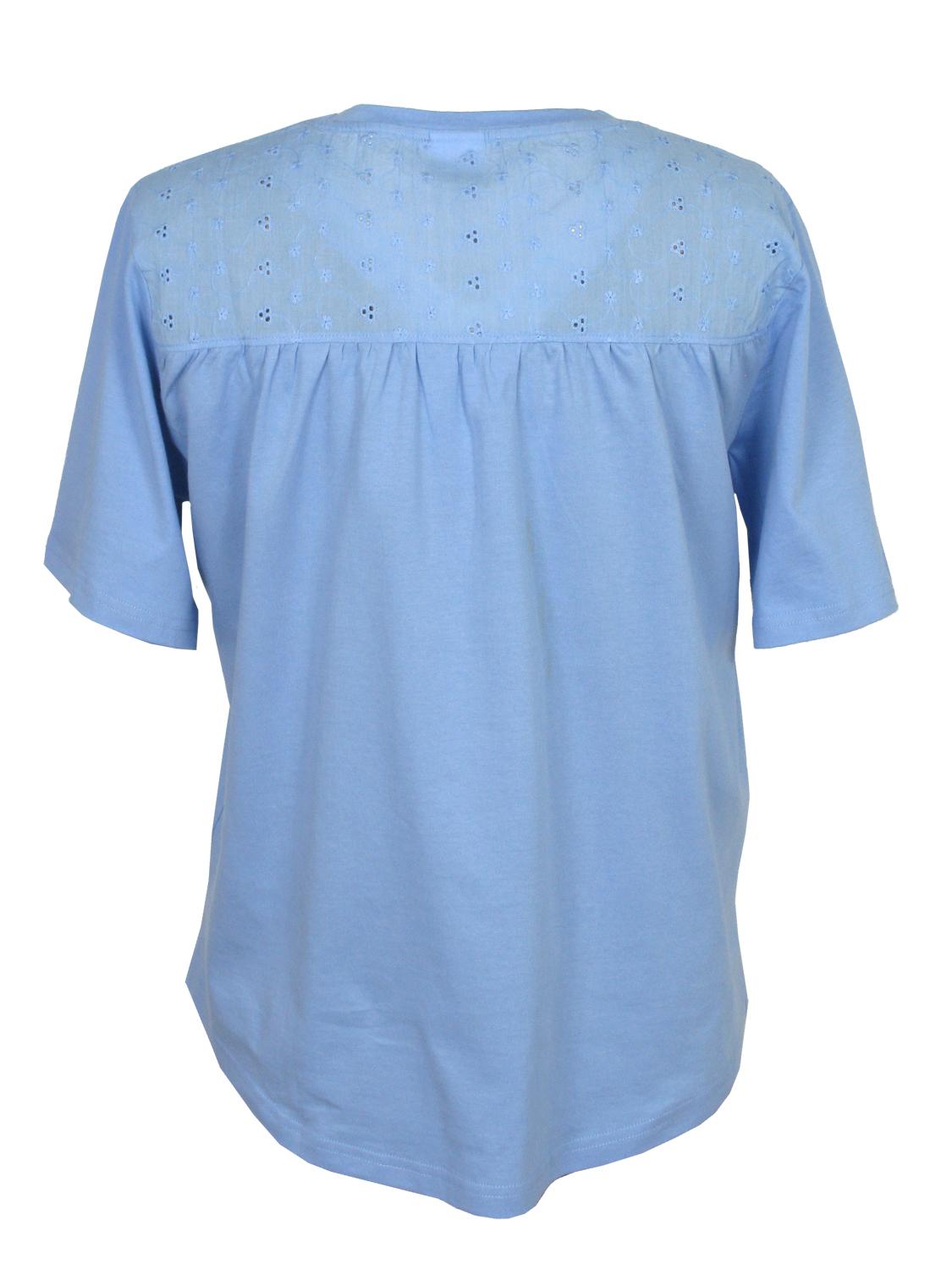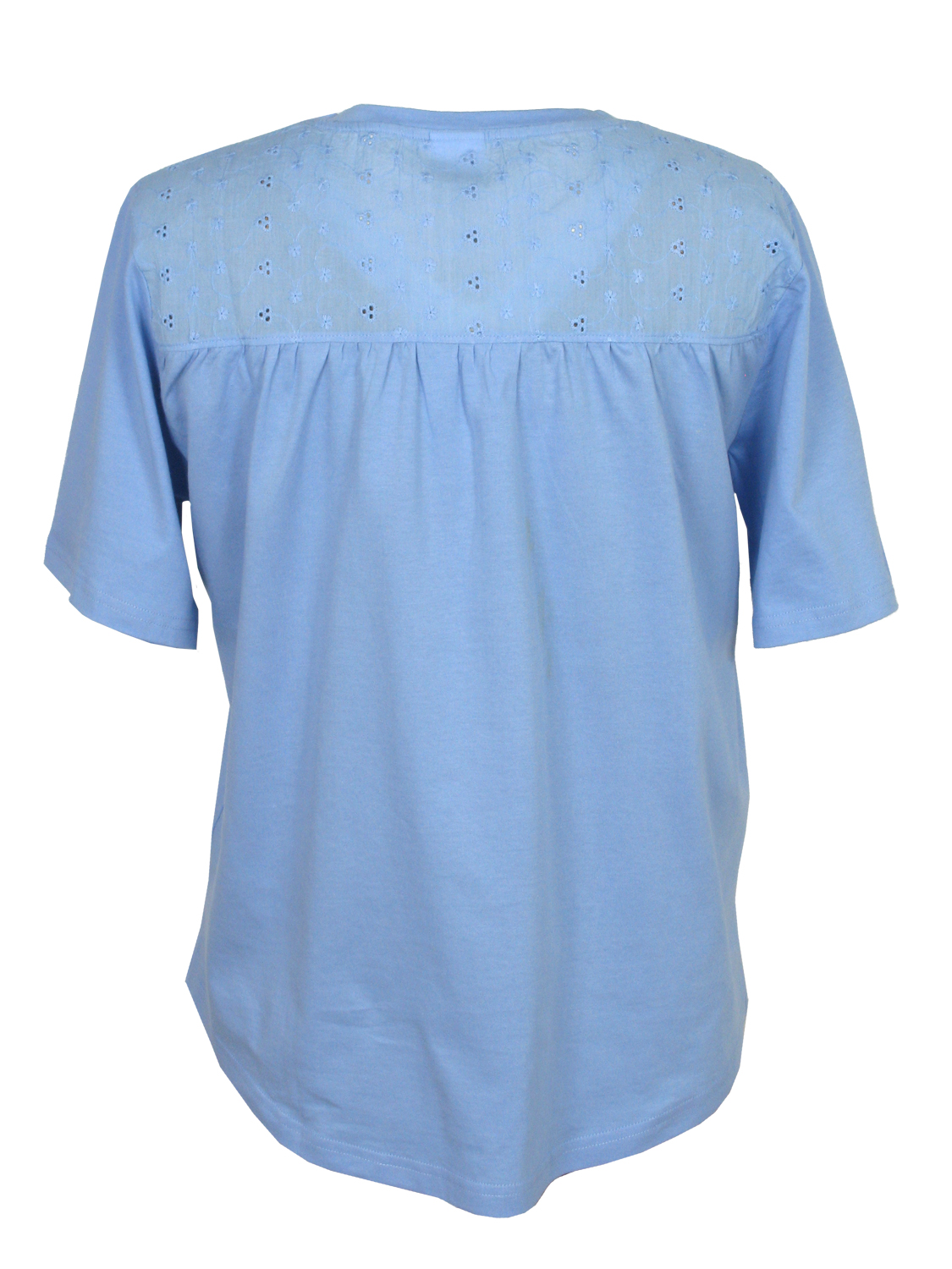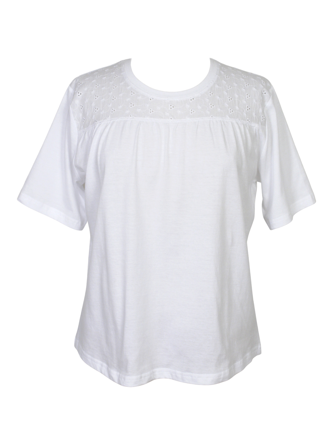 Trikåtopp med kort ärm. Oket på överdelen toppen, både fram och bak, är gjord i vävt tyg i ett sött broderat hålmönster. Rund halsringning och rundat avslut nertill. Finns i storlekarna S till XXL.
