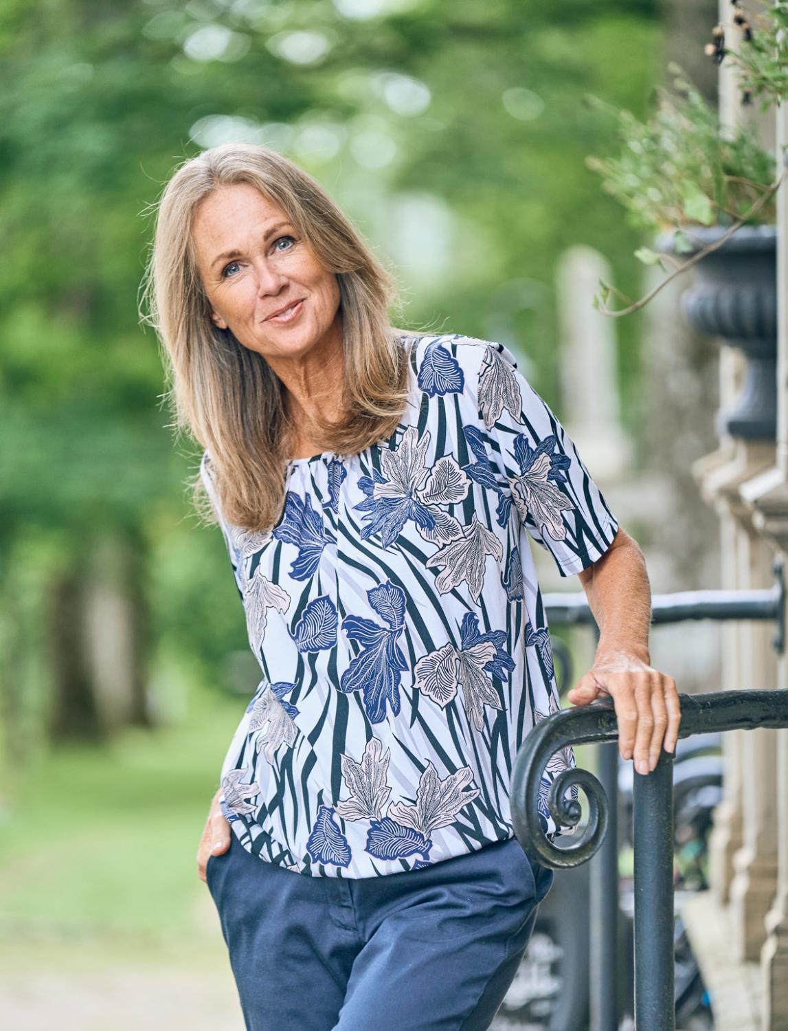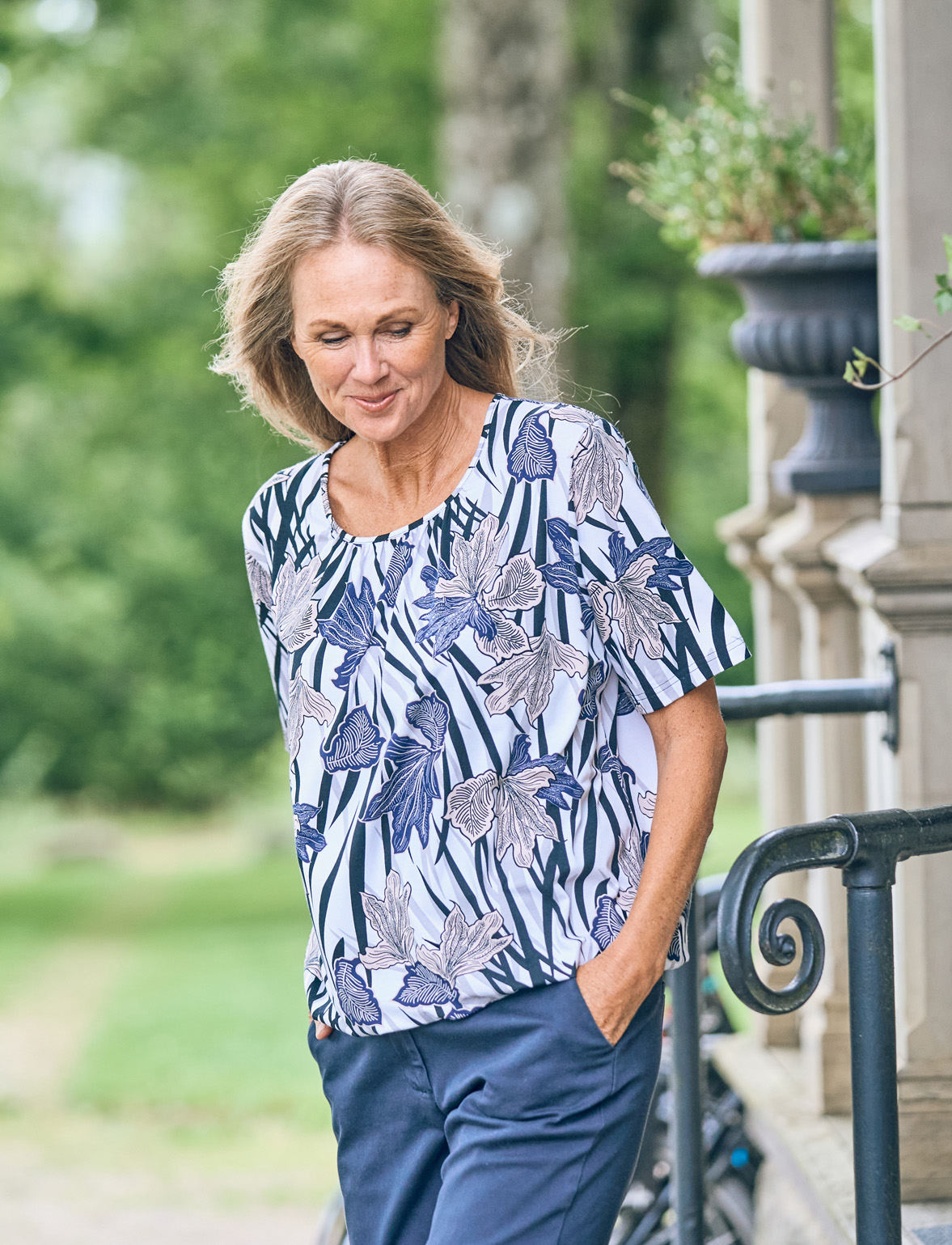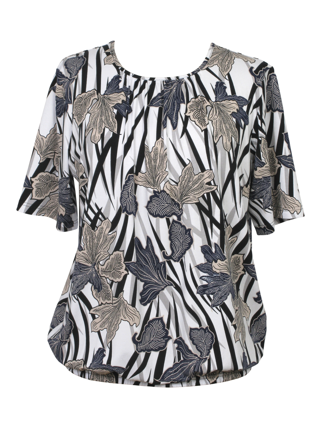Trikåtopp med kort ärm. Tryckt mönster i vit/svart/marin/sand/grå toner på vit botten. Rund halsringning med rynk mitt fram för lite bättre rymd över bysten. Resår i avslut nertill. Denna topp är tillverkad i Europa, i en mjuk och skön trikå av hög kvalitet. Finns i storlekarna S till XXL.