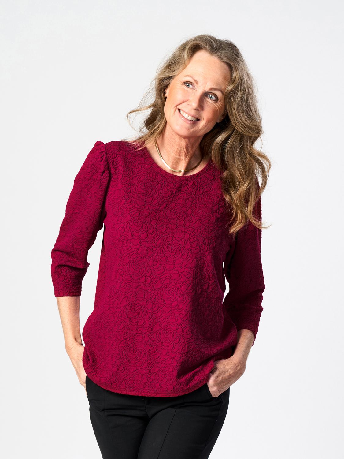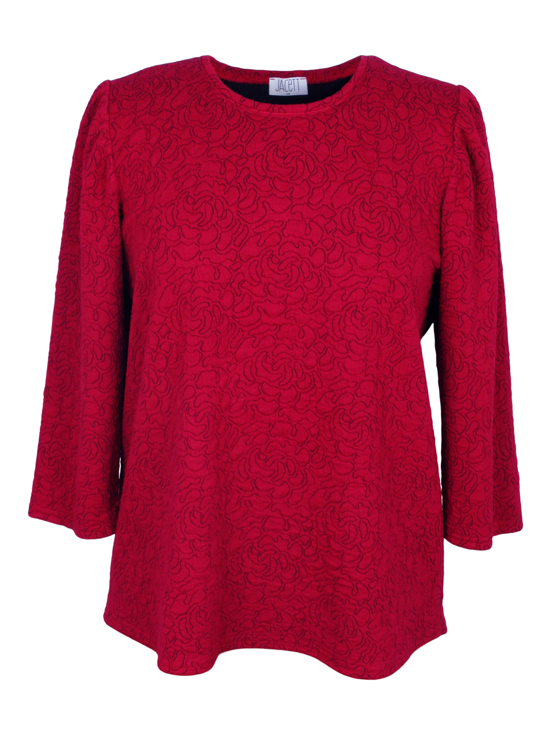 Topp med en nätt puffärm. Jacquardstickat relief-mönster. Svagt rundad nederkant. Detta plagg är tillverkat i Europa. Finns i storlekarna S till XXL.