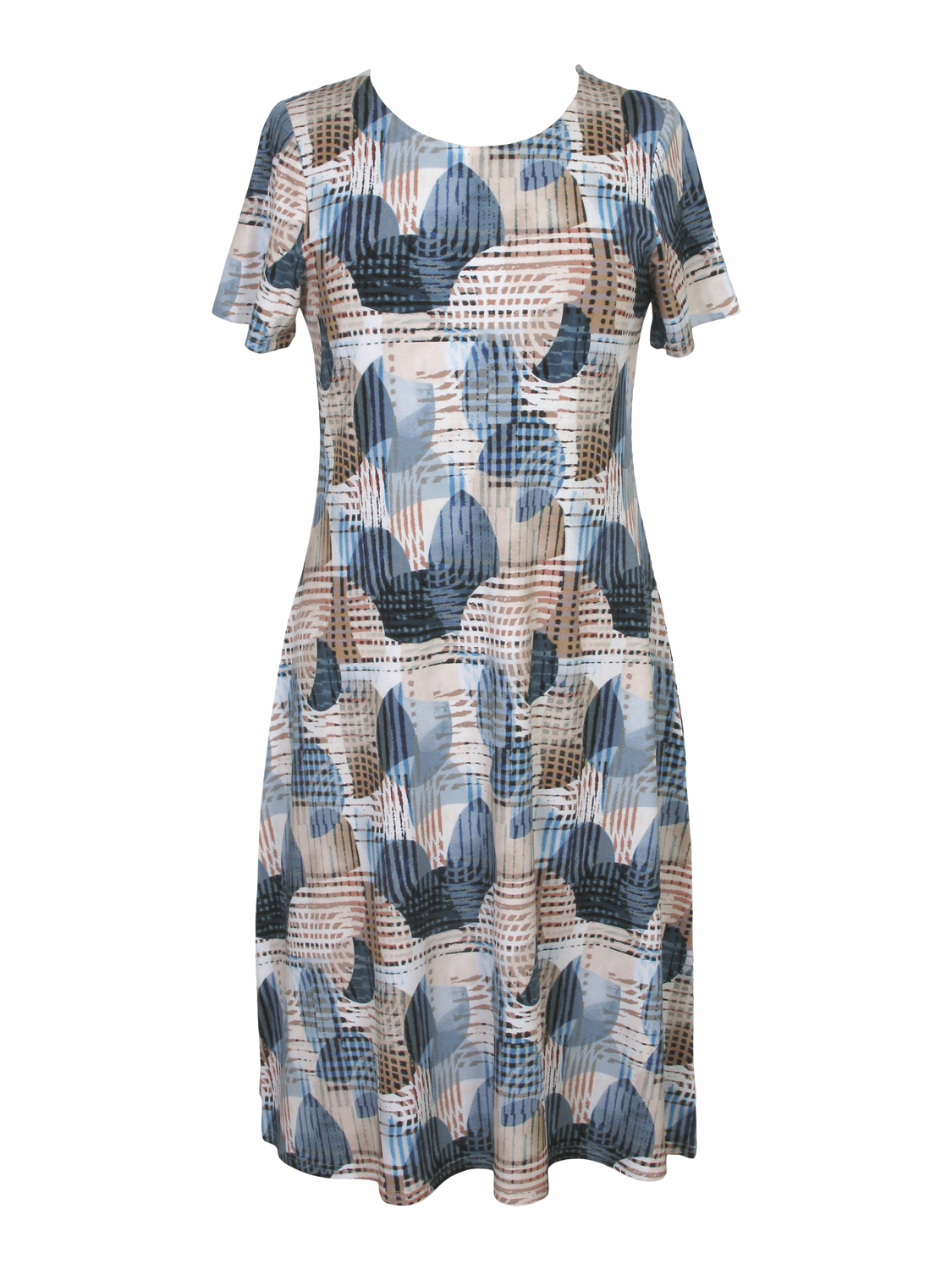 Mönstrad trikåklänning med kort ärm. Rund halsringning och rakt avslut nertill. Denna klänning är tillverkad i Europa, i en mjuk och skön trikå av hög kvalitet. Finns i storlekarna S till XXL.