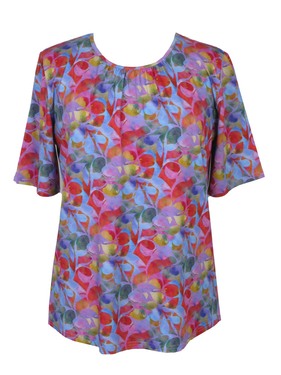 Härligt färgglad trikåtopp med kort ärm. Rund halsringning med lite rynk mitt fram. Lätt rundad nederkant. Denna topp är tillverkad i Europa, i en mjuk och skön trikå av hög kvalitet. Finns i storlekarna S till XXL.